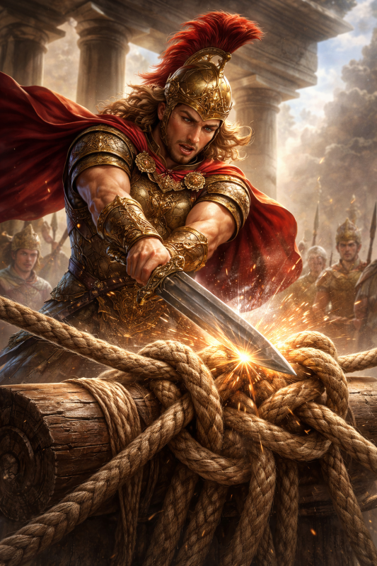 Nachdem er jedoch versucht hatte, ihn zu lösen, wandte er sich von den knorrigen Seilen ab und verkündete: “Es spielt keine Rolle, wie diese Seile gelöst werden.” Nach diesen Worten zog er das Schwert aus der Scheide und teilte den Knoten mit einem Schlag in die Hälfte.