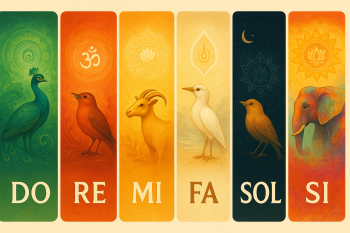 Jede der sieben Grundtöne der Oktave ist nach hinduistischer Philosophie mit einer Farbe und einem Schrei eines Vogels oder Tieres verbunden. Zum Beispiel ist die DO-Note mit der grünen Farbe und dem Schrei des Pfaus verbunden, Re ist mit dem Rot und dem Lied der Lerche verbunden und so weiter.