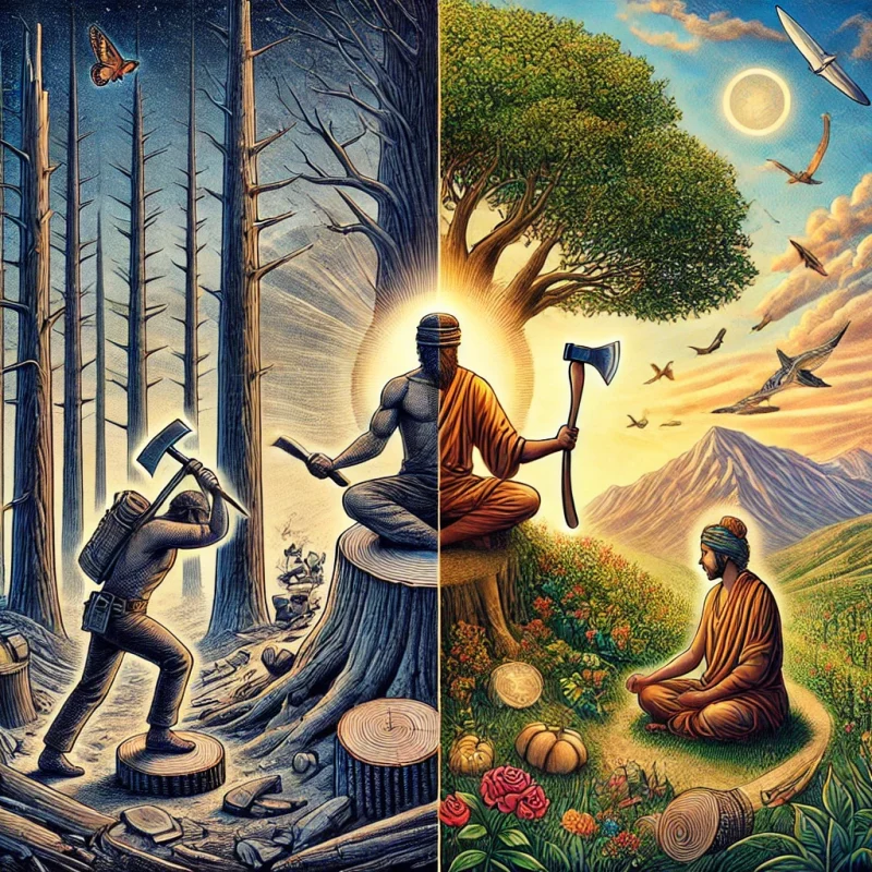 Parallel dazu gibt es spirituelle Wege, auf denen Menschen das Leben in der Welt ablehnen, das ihnen als Bremsen, Brutalisierung und Abkehr vom spirituellen Ideal und als Rückzug in die Einsamkeit oder ins Kloster erscheint. Sie widmen ihre ganze Zeit der inneren Transformation und spirituellen Evolution, das heißt, sie beschäftigen sich permanent mit dem “Schärfen der Axt”. Das sind gute Wege, Wege, die Erscheinung der Welt zu leugnen und zu transzendieren.