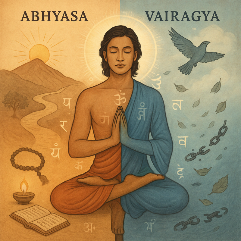 In wörtlicher Übersetzung bedeutet Abhyasa Leidenschaft und Vairagya bedeutet Loslösung, aber beide Wörter haben eine viel tiefere Bedeutung in der Yoga-Philosophie.
